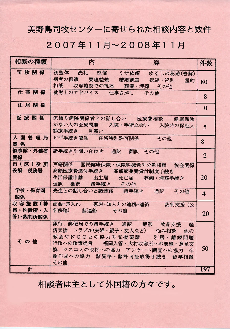◆ 日本カトリック教会司教団は13年前「教会は移動する人々を暖かく迎え入れ、彼らに奉仕する使命を持っている」という考えを発表。その実現のために福岡教区は6年前に美野島司牧センターを設立。ここは滞日外国人のためのセンターで、主にペルー人が来ている。スぺイン語のミサ、洗礼、子供の宗教教育をしている。日本語教室を開き、日常的には、アパート探し、病院、学校や保育園の相談、不景気の中、3Kの仕事が多く、職場の人間関係、給料の未払い、入国管理局の問題など悩みはつきない。その厳しい状況の中、家族を守るために一生懸命頑張っている姿は感動的である。