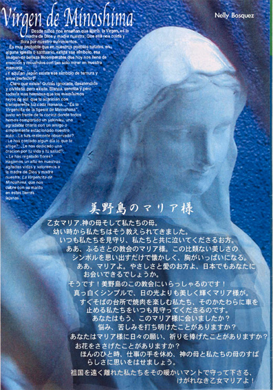 ![]() Desde ninos nos ensenan que Maria, la Virgen, es la madre de Dios y madre nuestra; Que ella nos cuida y llora por nuestro sufrimientos. Es muy probable que en nuestros pueblos natales, en alguna iglesia o santuario, exista ese simbolo, esa imagen de belleza incomparable que hoy nos llena de emocion y recuerdos con tan solo mirar en nuestra memoria. Y aqui en Japon existe ese simbolo de ternura y amor perfecto? ...Claro que existe! Quizas ignorada, desatendida y olvidada, pero existe: Blanca, sencilla y pero todavia mas hermosa que los mismisimos rayos de sol que la acarician con transparente luz cada manana. ..."Es la Virgencita de la Ilgesia de Minoshima'', justo en frente de la cocina donde todos hemos compartido un yakiniku, una agradable charla con un amigo o simplemente estacionado nuestro auto. La has realmente observado?, Le has contado algun dia lo que te aflige?; Le has dedicado una oracion por tu vida y tu salud?; Le has regalado flores? Hagamos un alto en nuestras agitadas vidas y valoremos a la madre de Dios y madre nuestra: La Virgencita de Minoshima, que nos cubre con su manto en estas tierras lejanas... |