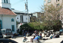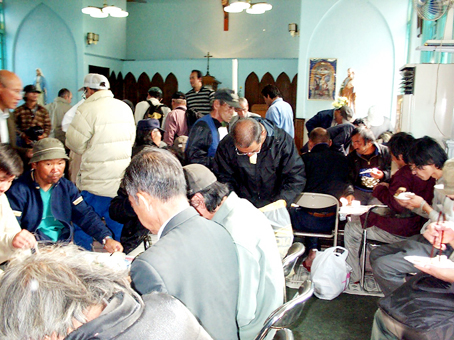 衣類バンクの活動も活発になっています。毎週火曜と金曜、野宿生活をしている130~150人の方々は炊き出しや衣類配付、健康相談のために美野島教会に来ています。カトリック、プロテスタント信徒、一般の婦人や野宿者の仲間を含て、幅広く活動をされたボランティアの皆さんに心から感謝したいと思います。 ![]() 美野島司牧センターで炊き出しを待つ人々 「福岡おにぎりの会」は冬になり、炊き出しをはじめました。おにぎりなどを公園に運んでいます。毎週金曜日ですのでぜひご参加とご協力、カンパなどお願いします。 |